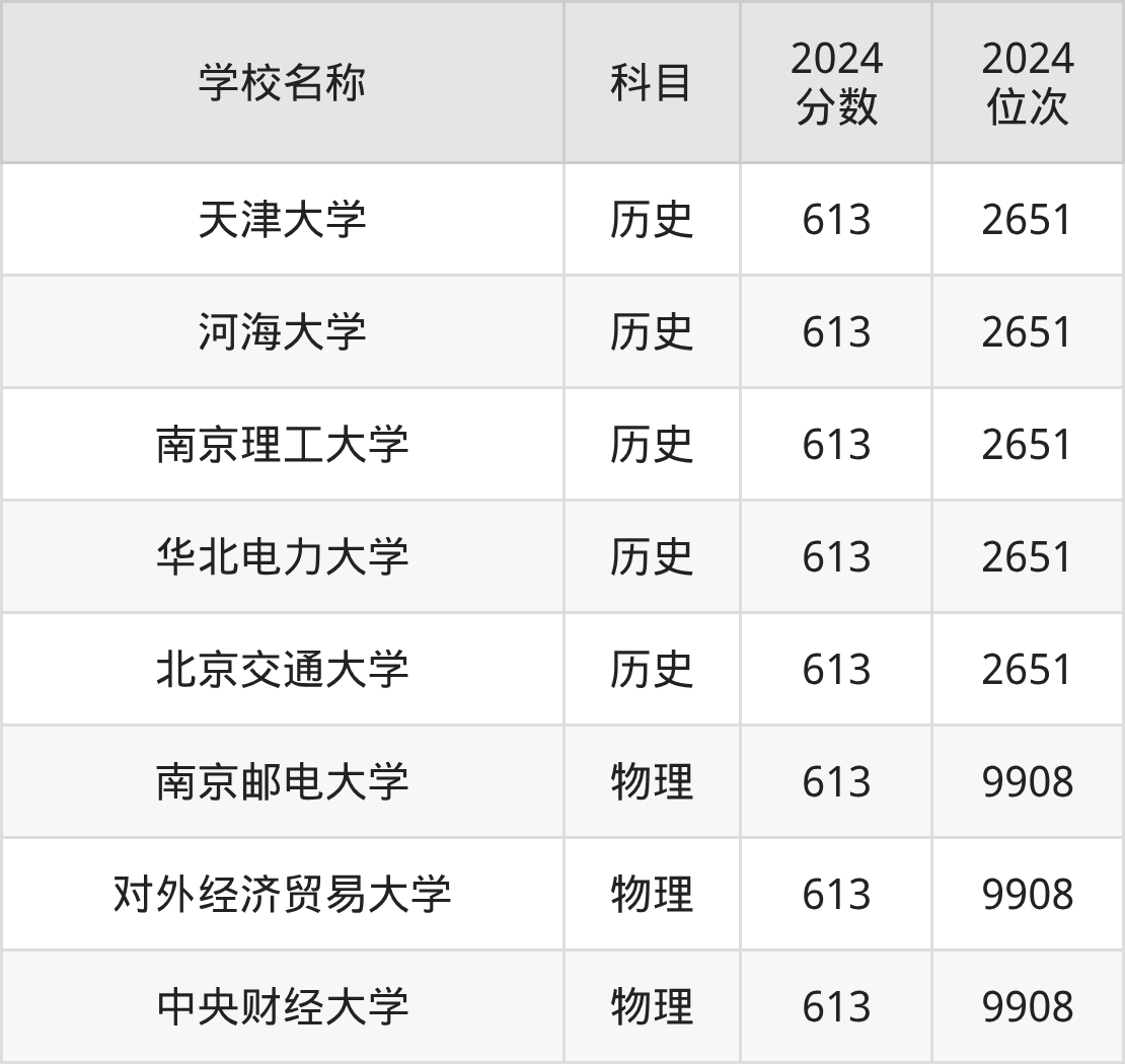 其中,物理组613分位于北京的学校有对外经济贸易大学、中央财经大学。历史组613分位于北京的学校有华北电力大学、北京交通大学。