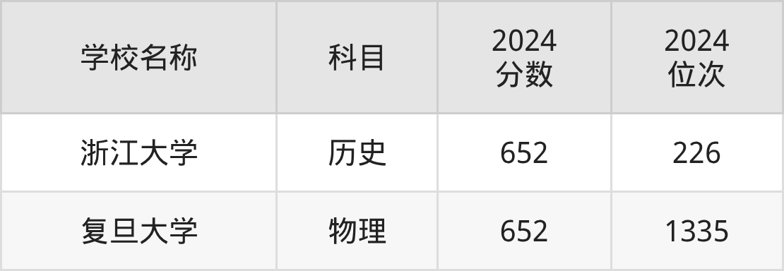 其中,物理组652分位于浙江的学校有复旦大学。历史组652分位于浙江的学校有浙江大学。