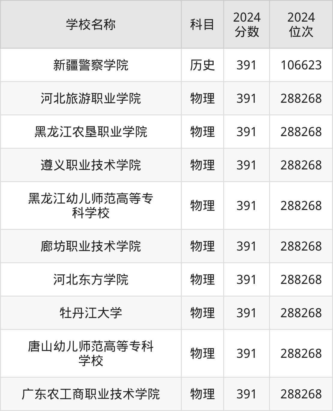 其中,物理组391分位于河北的学校有河北旅游职业学院。历史组391分位于新疆的学校有新疆警察学院。