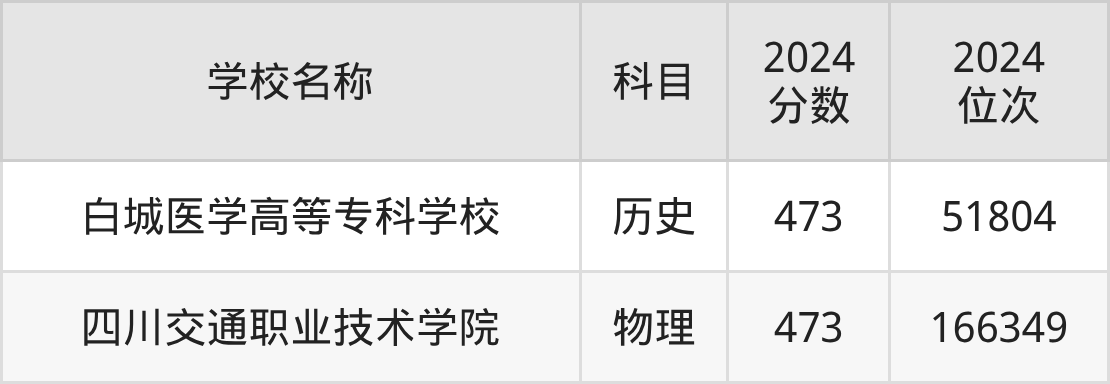 其中,物理组473分位于四川的学校有四川交通职业技术学院。历史组473分位于吉林的学校有白城医学高等专科学校。
