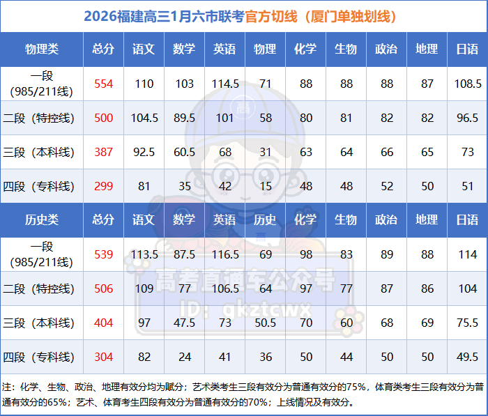 2026届福建高三六市联考官方切线已正式公布。其中,物理类特控线(二段)为500分,本科线(三段)为387分;历史类特控线为506分,本科线为404分。厦门市在此次联考中单独划定了模拟参考线,物理本科线393分、历史本科线380分。