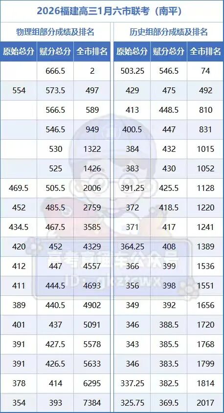 历史组:同样公布原始分、赋分总分及排名,如历史组原始总分503.25分,赋分后546.5分,位列全市第74名;原始总分325.75分,赋分后369.5分,位列全市第2017名。