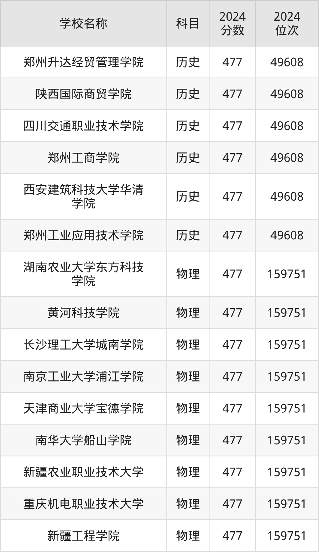 其中,物理组477分位于江苏的学校有南京工业大学浦江学院。历史组477分位于河南的学校有郑州升达经贸管理学院。