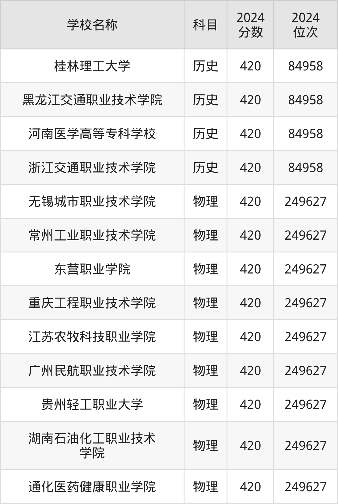 | 长春职业技术大学 | 历史 | 420 | 105478 |