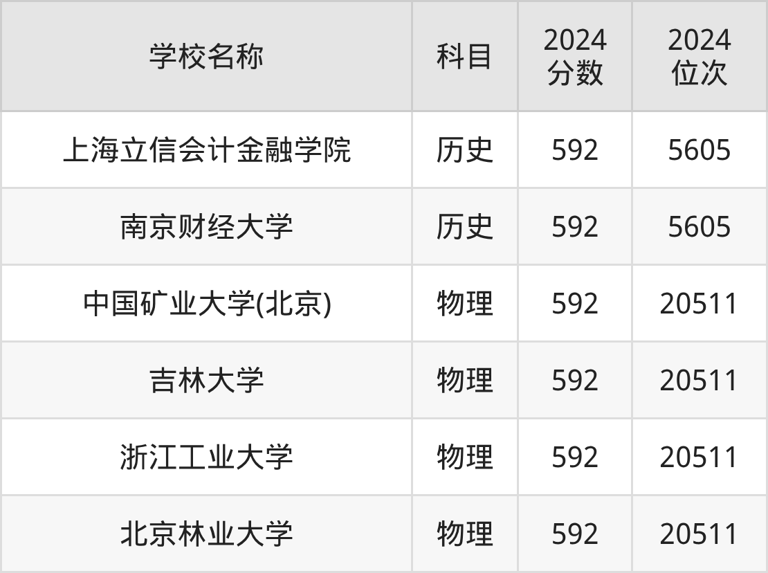其中,物理组592分位于上海的学校有中国矿业大学(北京)、北京林业大学。历史组592分位于上海的学校有上海立信会计金融学院。