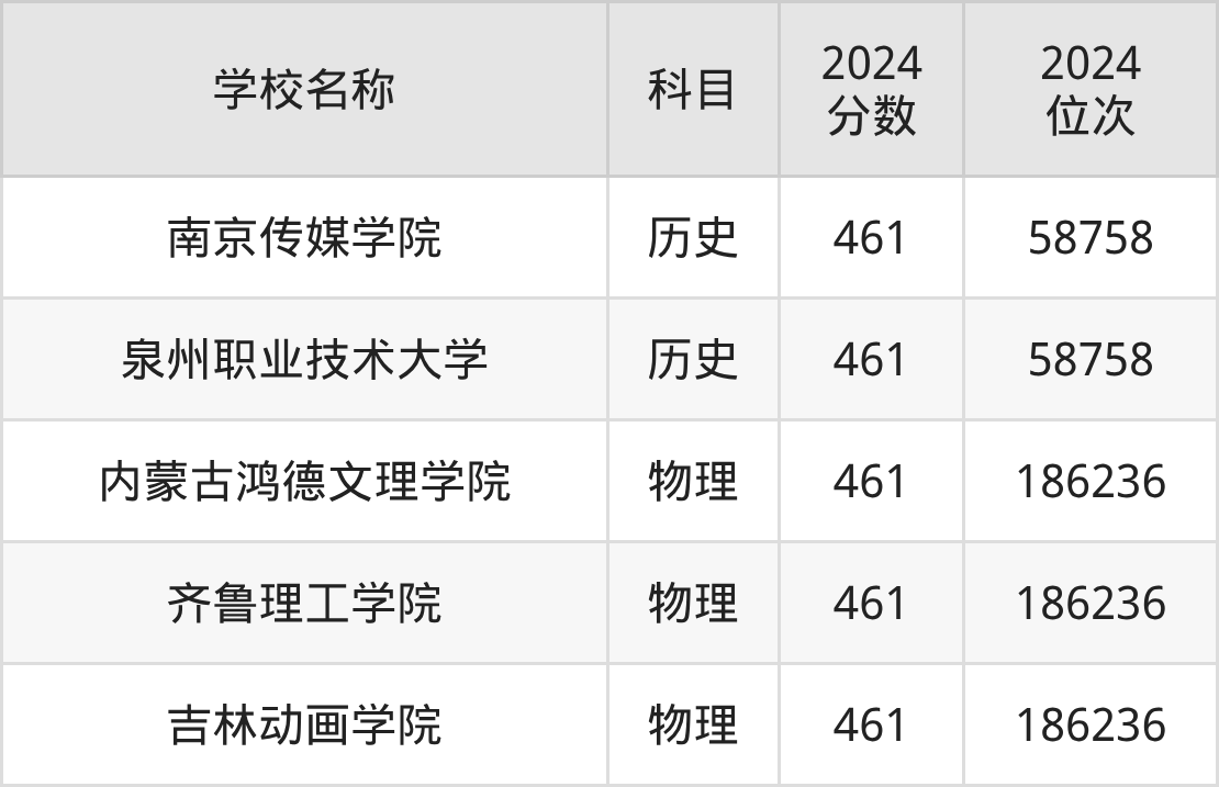 其中,物理组461分位于内蒙古的学校有内蒙古鸿德文理学院。历史组461分位于江苏的学校有南京传媒学院。