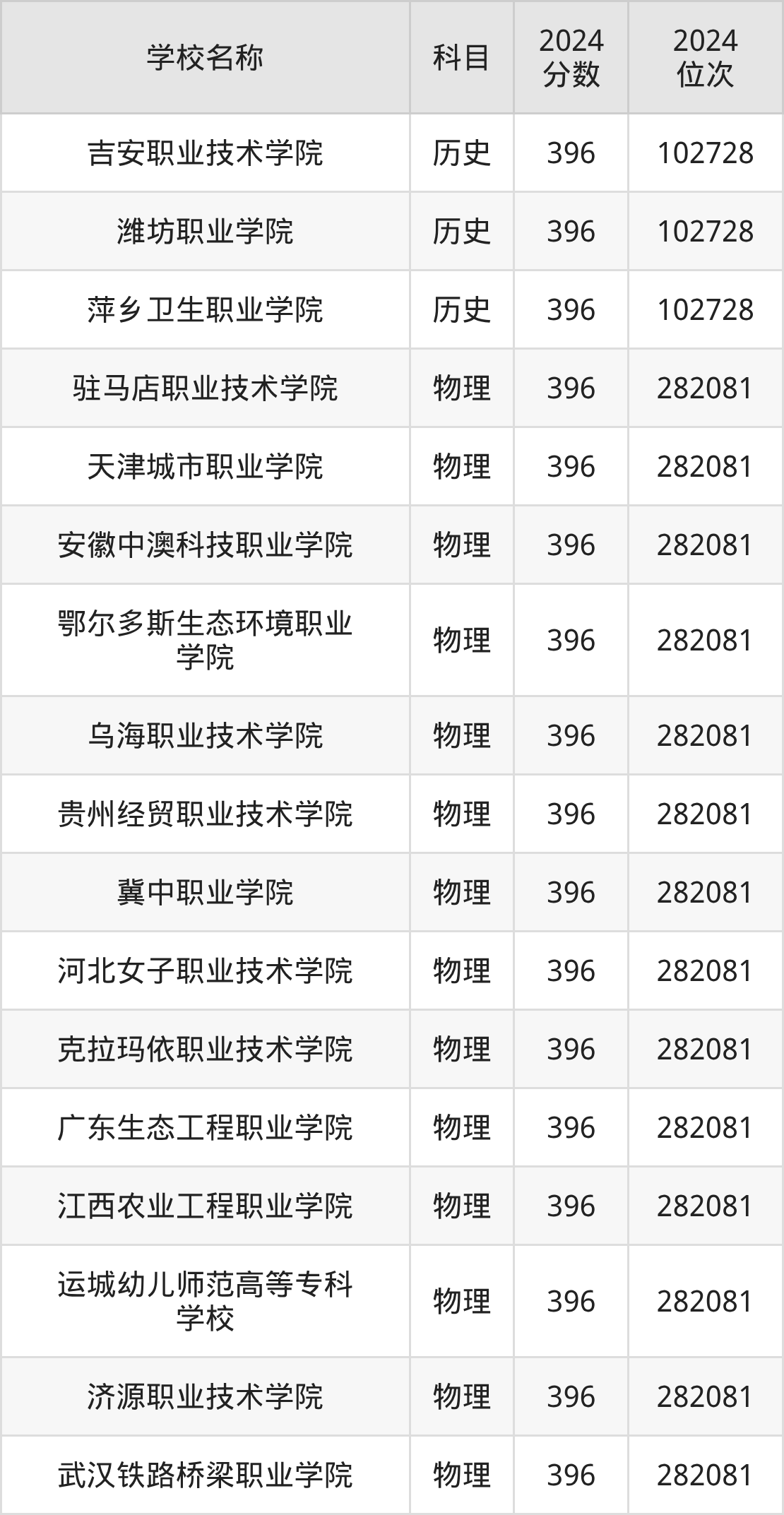其中,物理组396分位于河北的学校有冀中职业学院。历史组396分位于江西的学校有吉安职业技术学院。