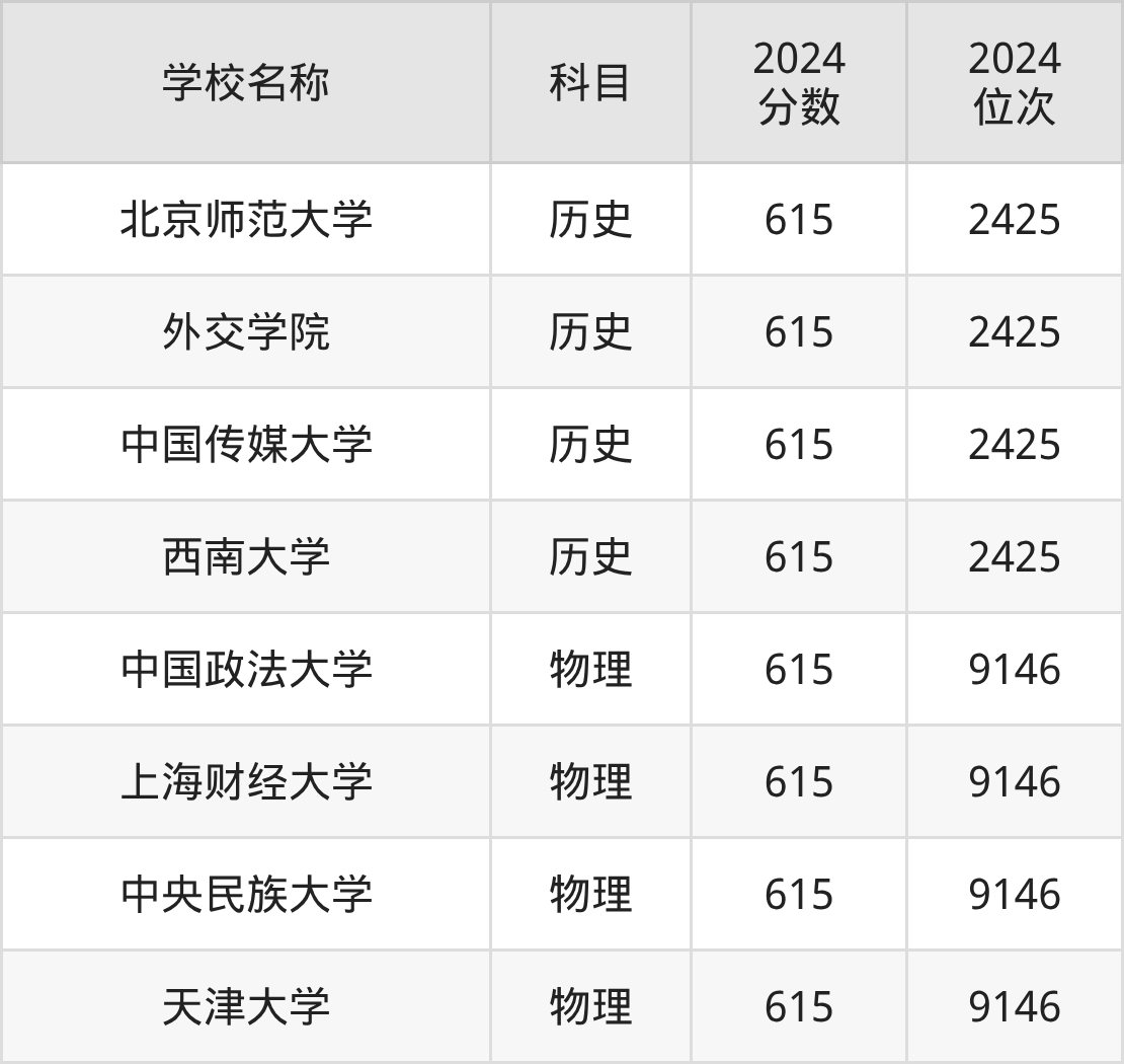 其中,物理组615分位于北京的学校有中国政法大学、中央民族大学。历史组615分位于北京的学校有北京师范大学、外交学院、中国传媒大学。