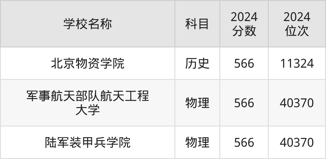 其中,物理组566分位于北京的学校有中国人民解放军军事航天部队航天工程大学、中国人民解放军陆军装甲兵学院。历史组566分位于北京的学校有北京物资学院。