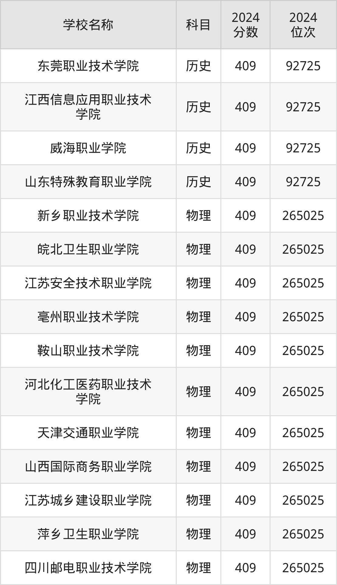其中,物理组409分位于广东的学校有河北化工医药职业技术学院。历史组409分位于广东的学校有东莞职业技术学院。