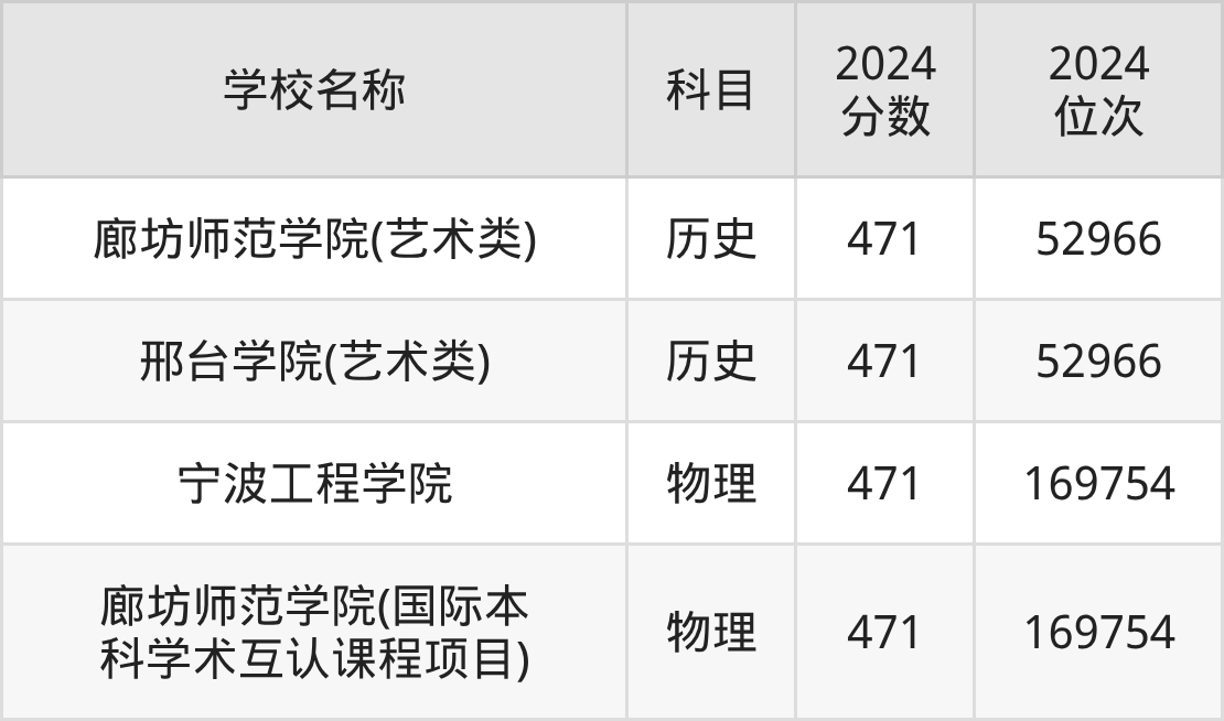 其中,物理组471分位于河北的学校有廊坊师范学院(国际本科学术互认课程项目)。历史组471分位于河北的学校有廊坊师范学院(艺术类)、邢台学院(艺术类)。
