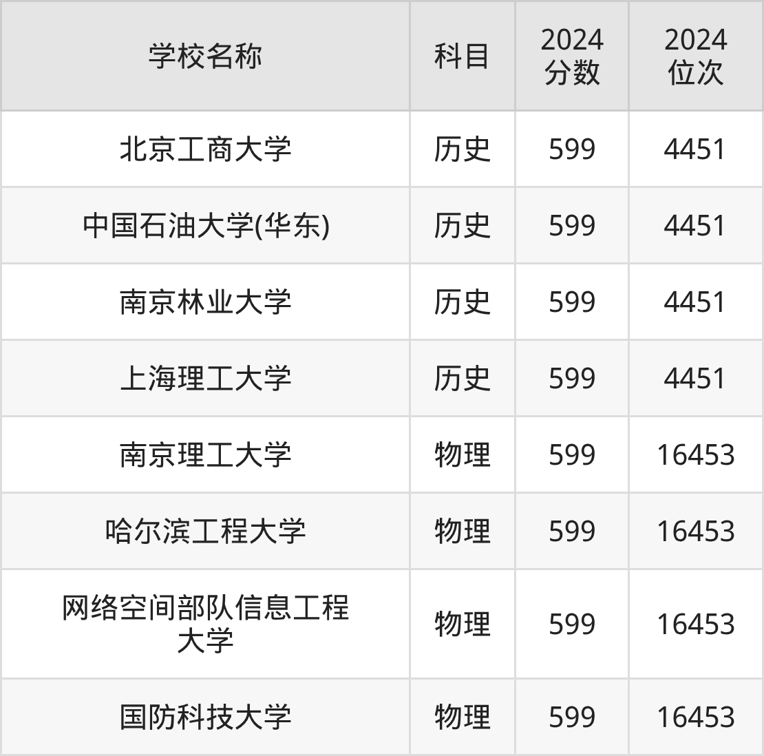 回看2024年河北高考最低分为599分的理科大学名单,物理组有4条数据,历史组有4条数据。