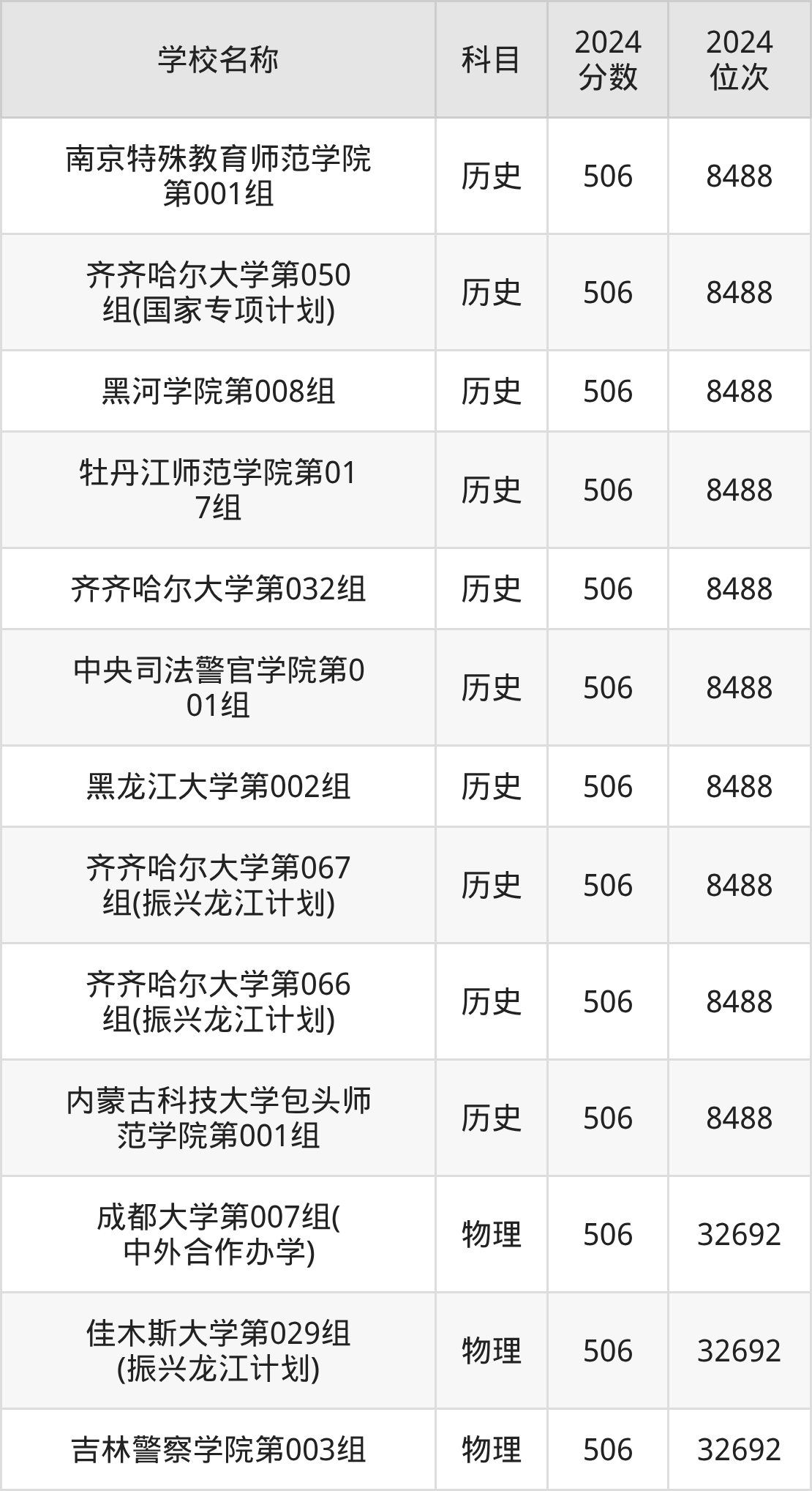 回看2024年黑龙江高考最低分为506分的文科大学名单,物理组有3条数据,历史组有10条数据。