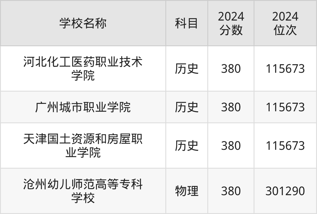 回看2024年河北高考最低分为380分的公办大专学校名单,物理组有1条数据,历史组有3条数据。