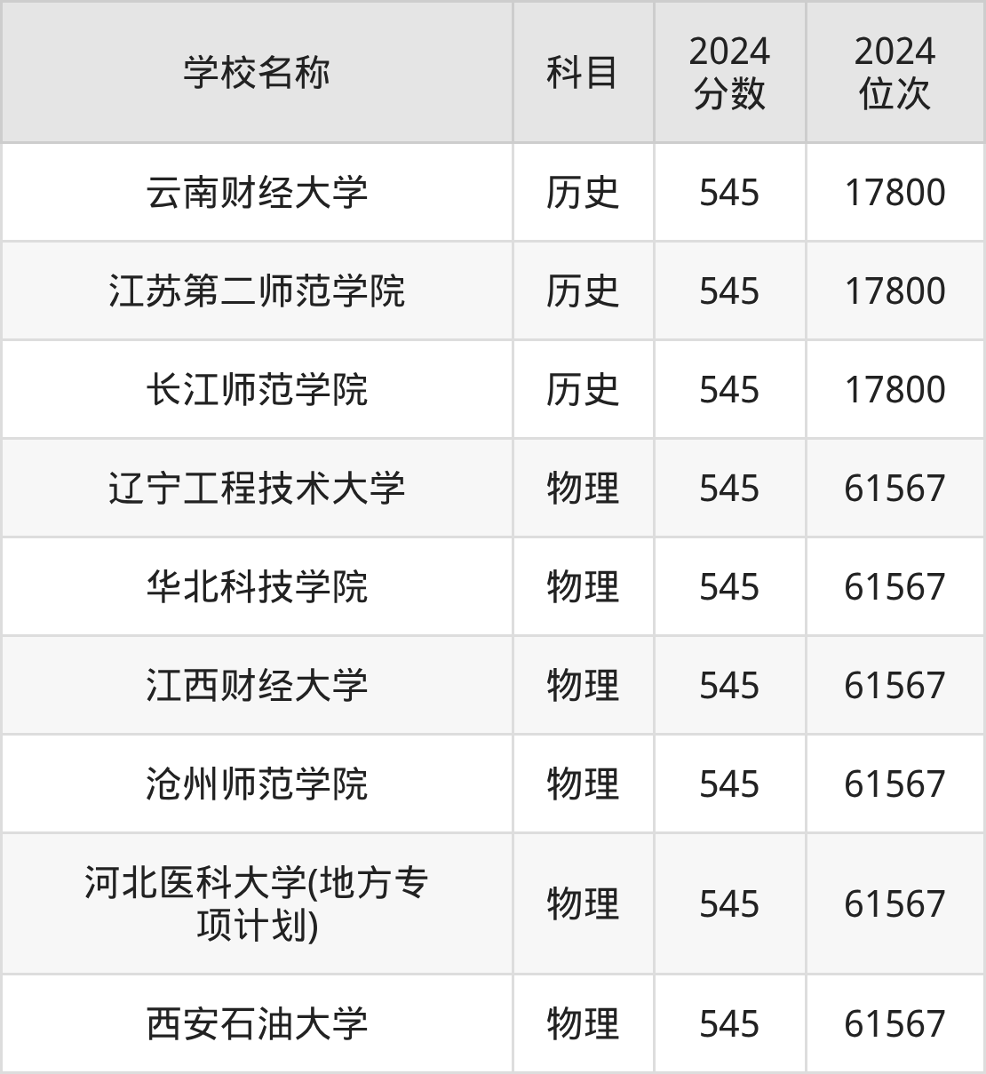 回看2024年河北高考最低分为545分的公办本科大学名单,物理组有6条数据,历史组有3条数据。
