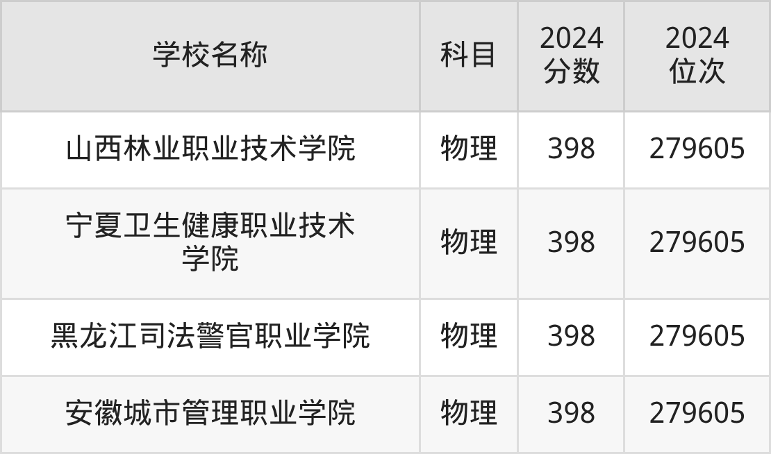 | 阜阳职业技术学院 | 物理 | 398 | 293648 |
