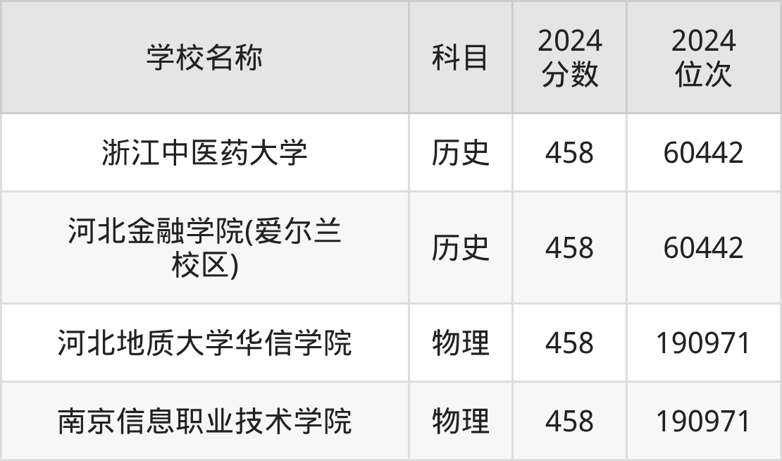 回看2024年河北高考最低分为458分的理科大学名单,物理组有2条数据,历史组有2条数据。