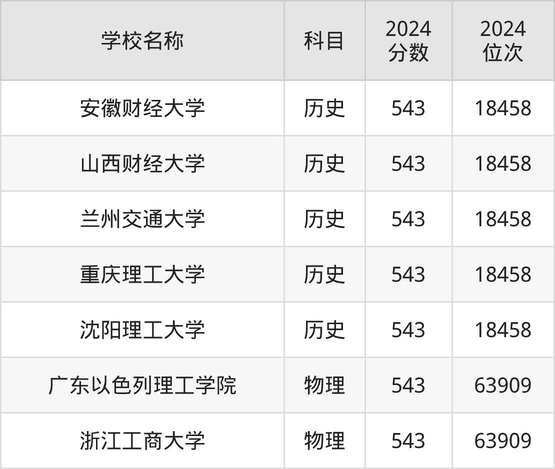 其中,物理组543分位于广东的学校有广东以色列理工学院。历史组543分位于安徽的学校有安徽财经大学。