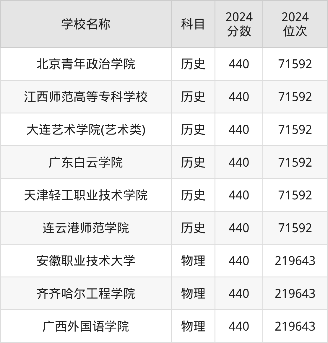 其中,物理组440分位于安徽的学校有安徽职业技术大学。历史组440分位于北京的学校有北京青年政治学院。