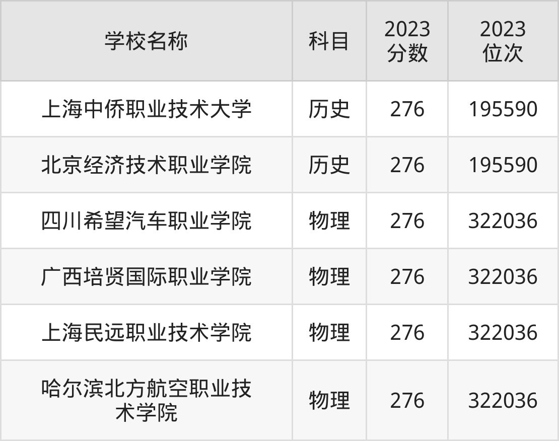 其中,物理组276分位于上海的学校有上海民远职业技术学院。历史组276分位于上海的学校有北京经济技术职业学院。