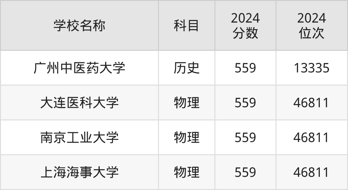 其中,物理组559分位于广东的学校有上海海事大学。历史组559分位于广东的学校有广州中医药大学。