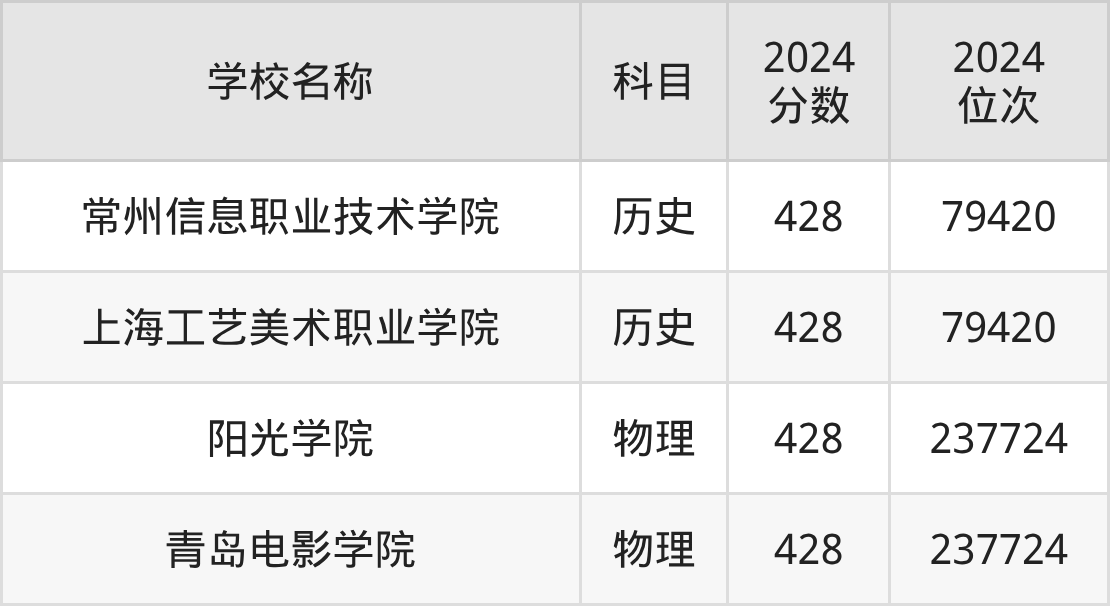 其中,物理组428分位于福建的学校有阳光学院。历史组428分位于上海的学校有上海工艺美术职业学院。