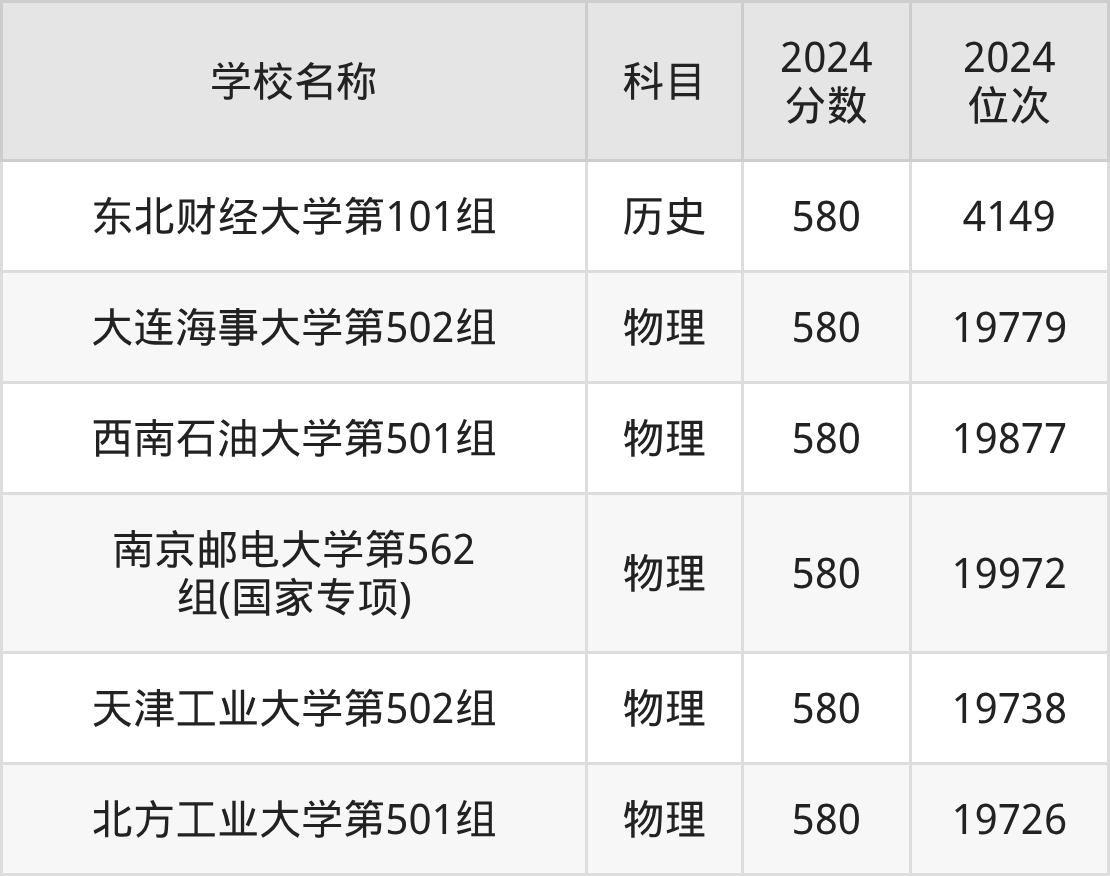 回看2024年江西高考最低分为580分的理科大学名单,物理组有5条数据,历史组有1条数据。