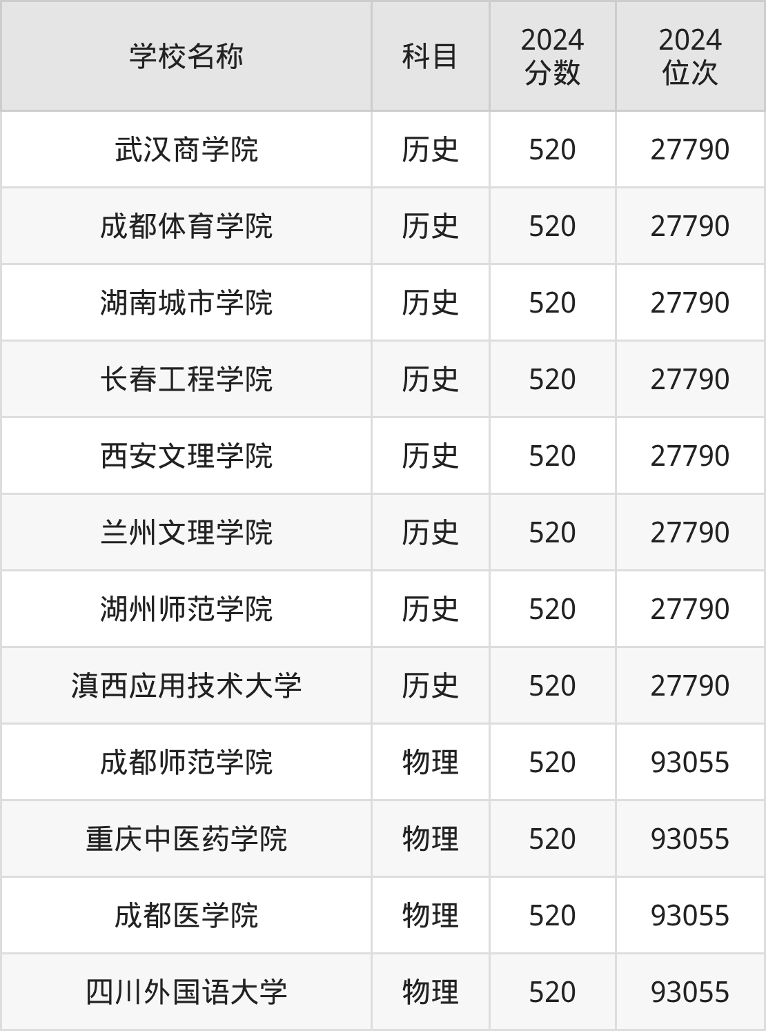 其中,物理组520分位于四川的学校有成都师范学院。历史组520分位于浙江的学校有湖州师范学院。