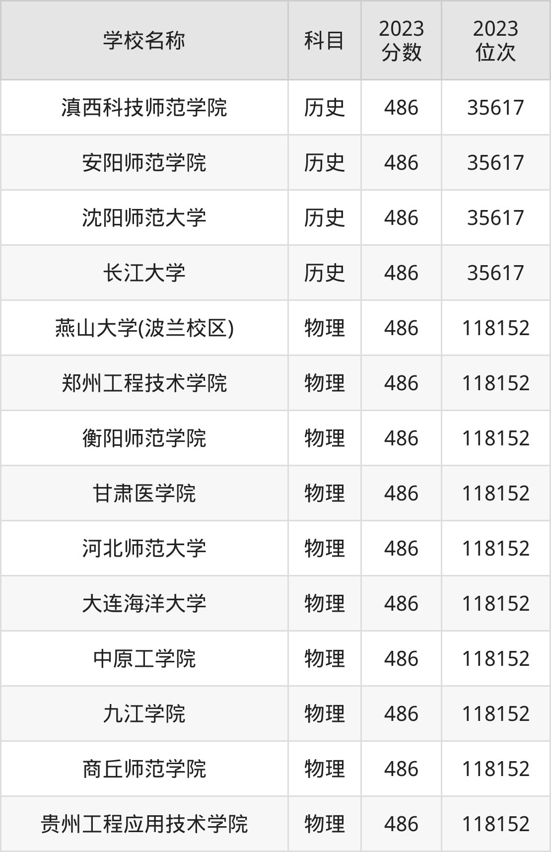 其中,物理组486分位于河北的学校有燕山大学(波兰校区)。历史组486分位于云南的学校有滇西科技师范学院。
