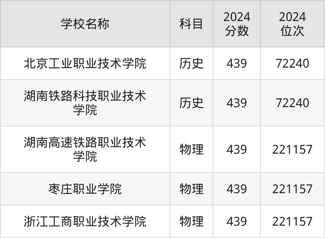 回看2024年河北高考最低分为439分的公办大专学校名单,物理组有3条数据,历史组有2条数据。
