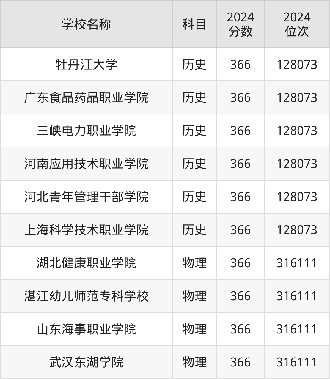 | 汉中职业技术学院 | 历史 | 366 | 148854 |