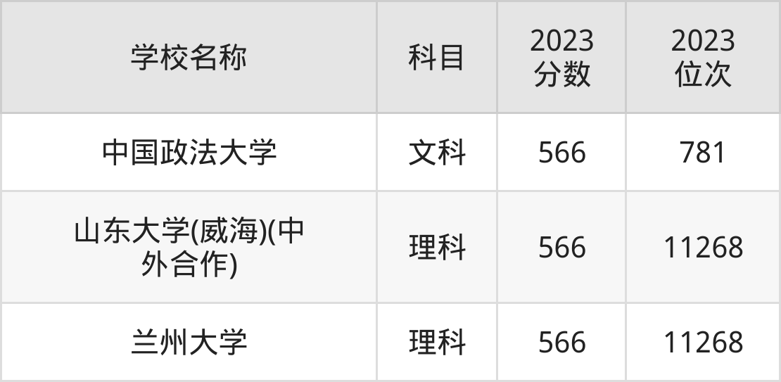 其中,理科566分位于山东的学校有山东大学(威海)(中外合作)。文科566分位于北京的学校有中国政法大学。