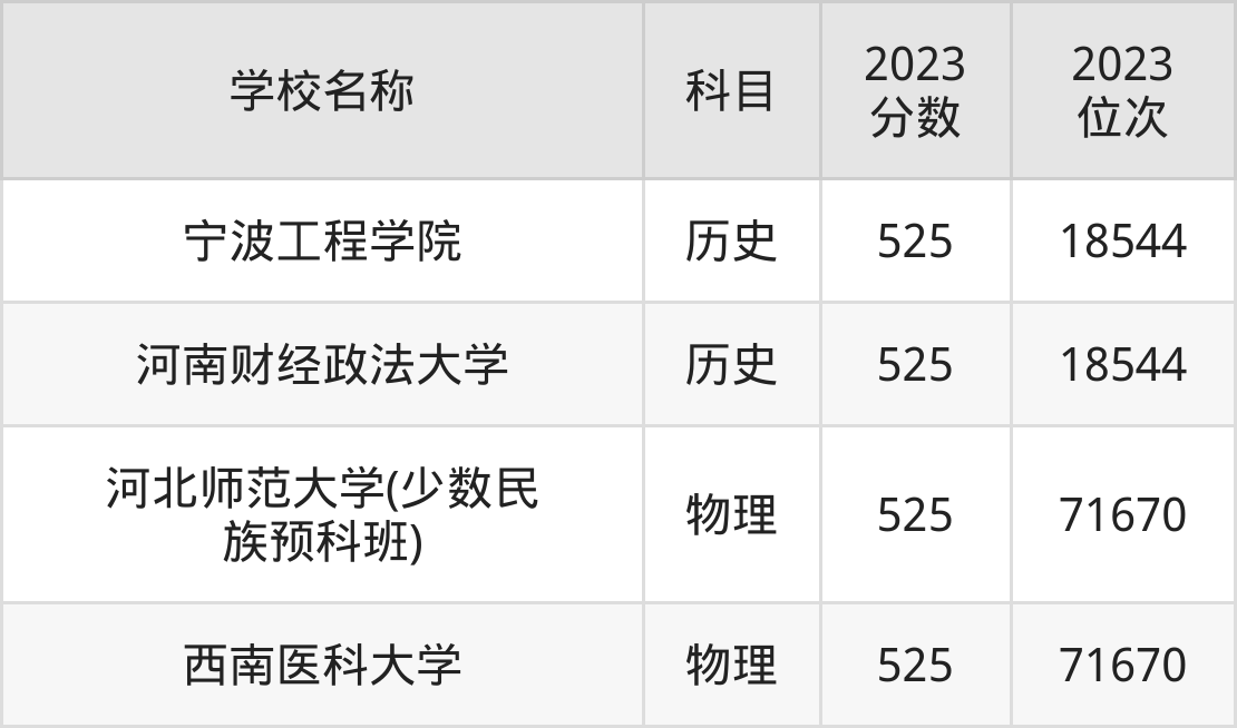 回看2023年河北高考最低分为525分的二本大学名单,物理组有2条数据,历史组有2条数据。