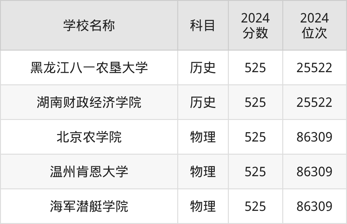 其中,物理组525分位于北京的学校有北京农学院。历史组525分位于黑龙江的学校有黑龙江八一农垦大学。