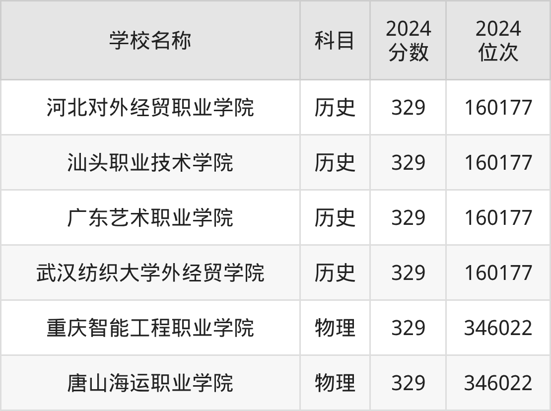 其中,物理组329分位于河北的学校有唐山海运职业学院。历史组329分位于河北的学校有河北对外经贸职业学院。