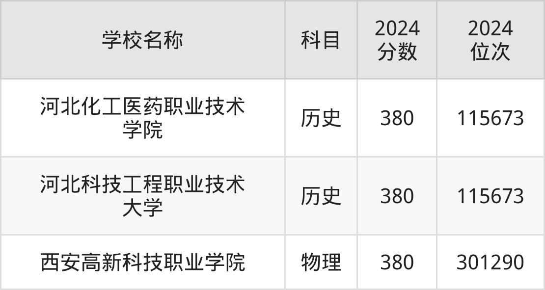 其中,物理组380分位于陕西的学校有西安高新科技职业学院。历史组380分位于河北的学校有河北化工医药职业技术学院。