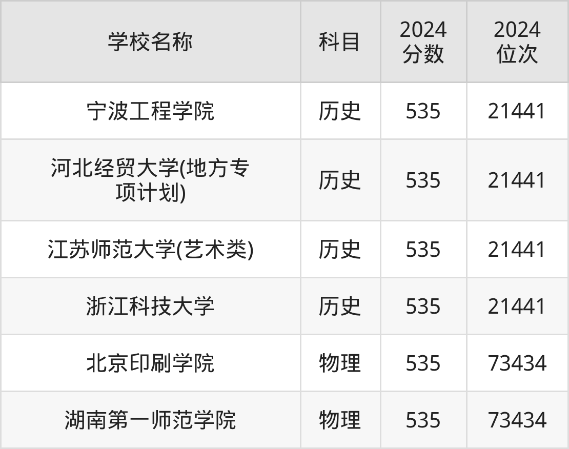 回看2024年河北高考最低分为535分的二本大学名单,物理组有2条数据,历史组有4条数据。