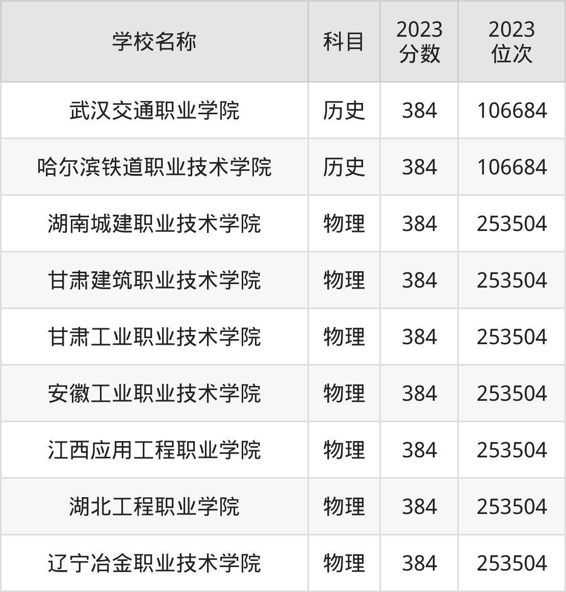 其中,物理组384分位于湖南的学校有湖南城建职业技术学院。历史组384分位于湖北的学校有武汉交通职业学院。