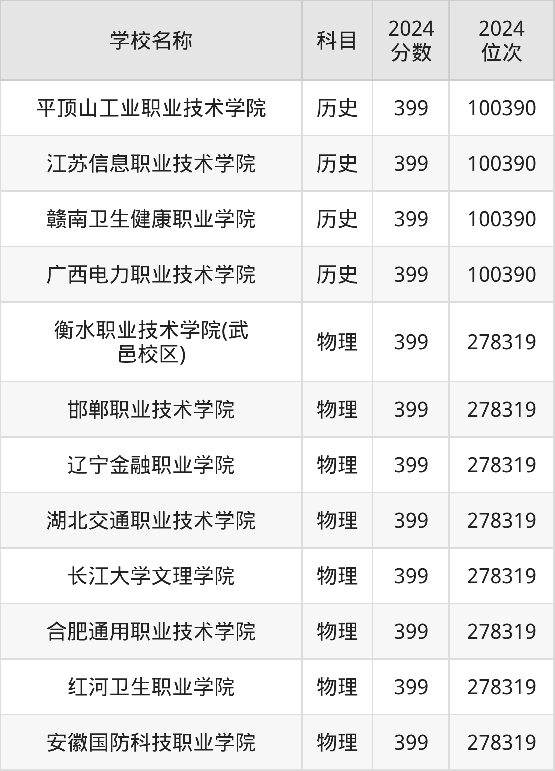 其中,物理组399分位于江苏的学校有衡水职业技术学院(武邑校区)、邯郸职业技术学院。历史组399分位于江苏的学校有江苏信息职业技术学院。