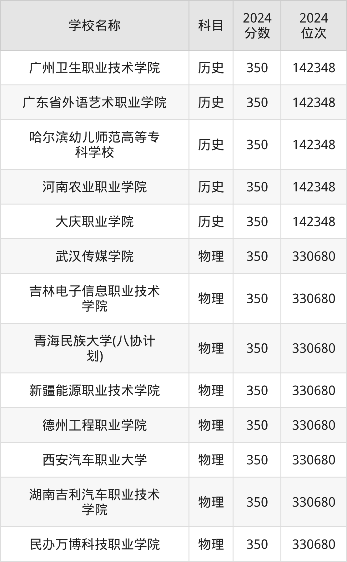 | 秦皇岛职业技术学院 | 历史 | 350 | 161725 |