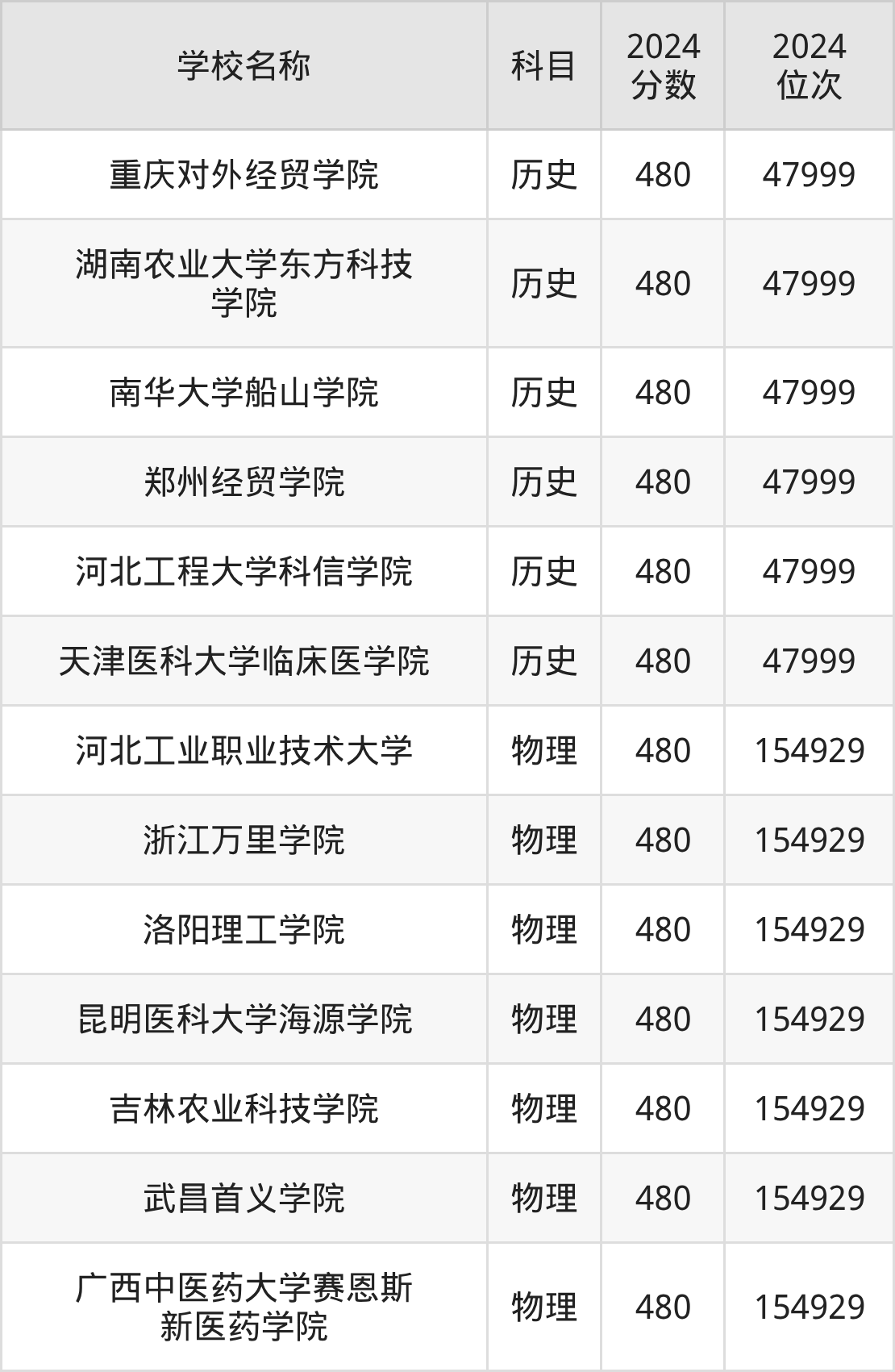 回看2024年河北高考最低分为480分的理科大学名单,物理组有7条数据,历史组有6条数据。