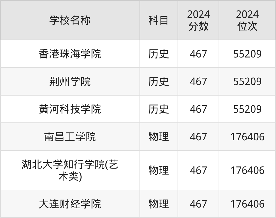 其中,物理组467分位于江西的学校有南昌工学院。历史组467分位于的学校有香港珠海学院。
