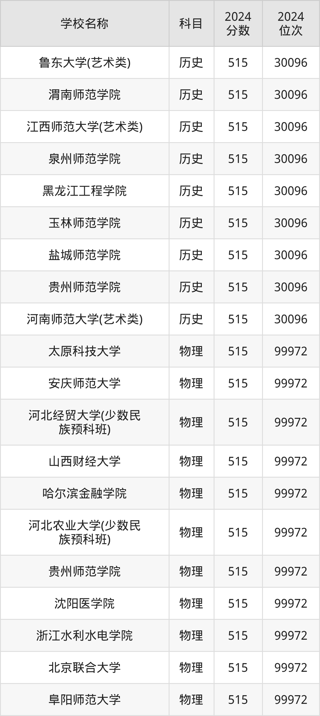 回看2024年河北高考最低分为515分的二本大学名单,物理组有11条数据,历史组有9条数据。