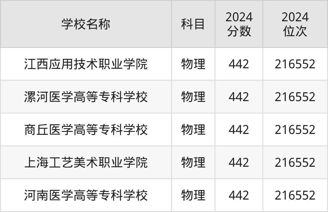 | 白城医学高等专科学校 | 物理 | 442 | 179333 |