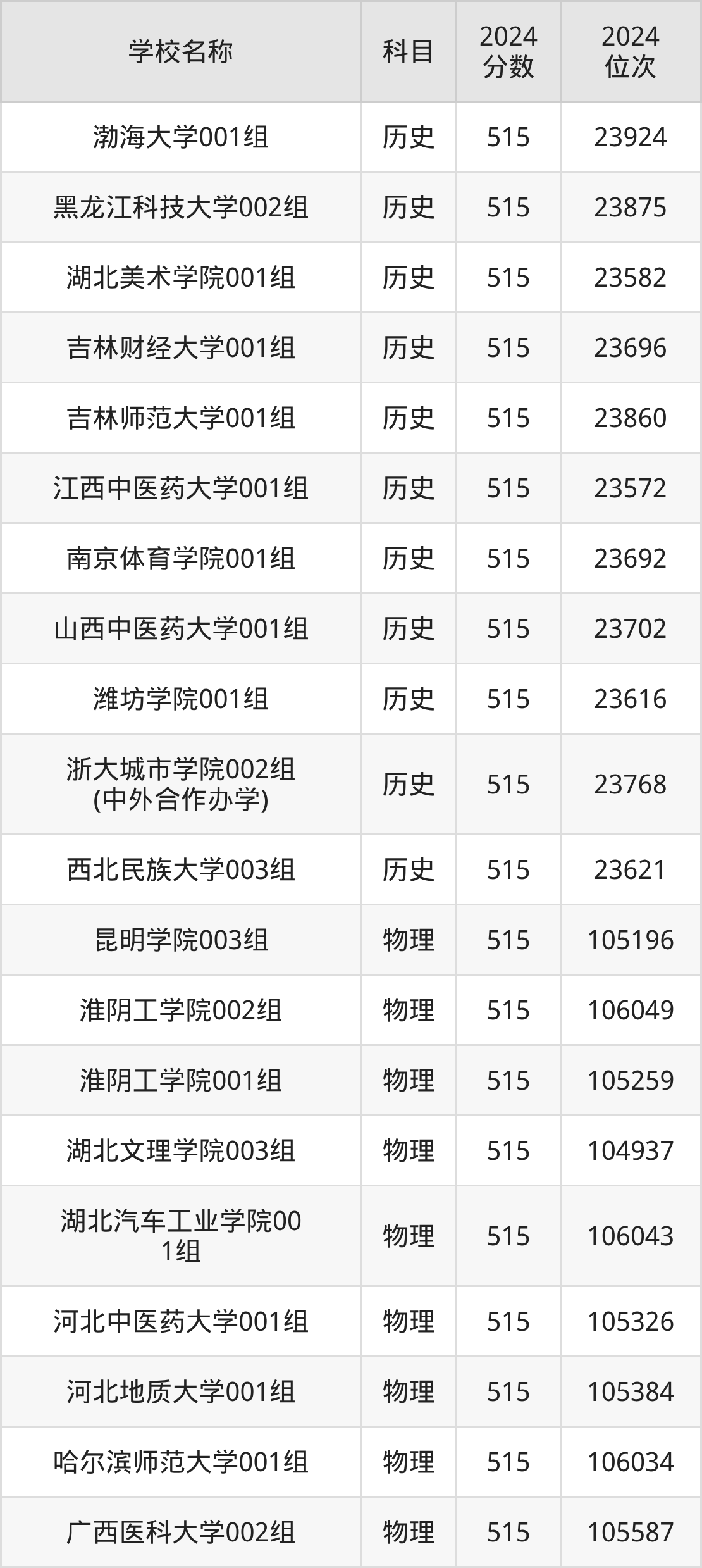 其中,物理组515分位于浙江的学校有淮北师范大学、安徽科技学院、滁州学院。历史组515分位于浙江的学校有浙大城市学院。