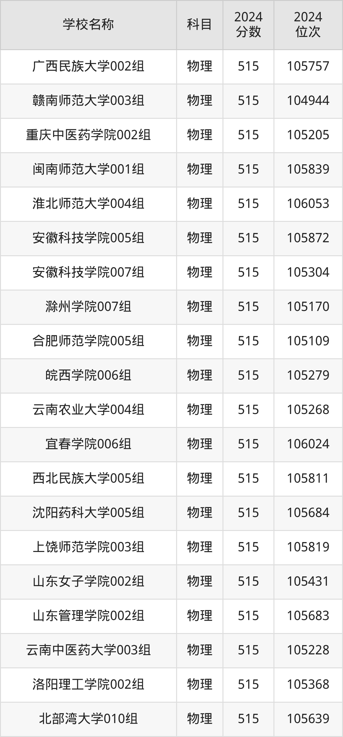 | 安徽医科大学007组 (中外合作办学) | 物理 | 515 | 112439 |