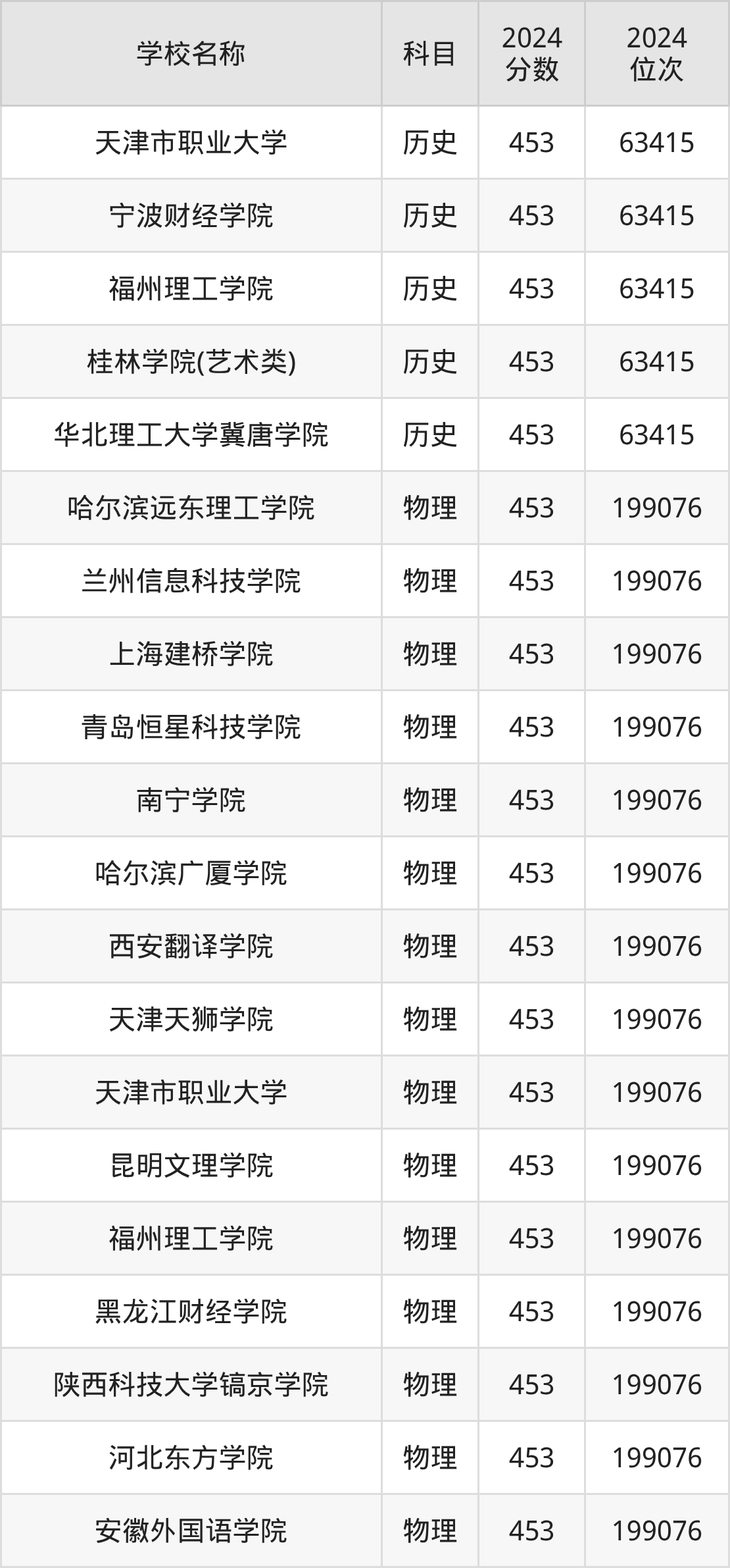 其中,物理组453分位于河北的学校有河北东方学院。历史组453分位于河北的学校有华北理工大学冀唐学院。