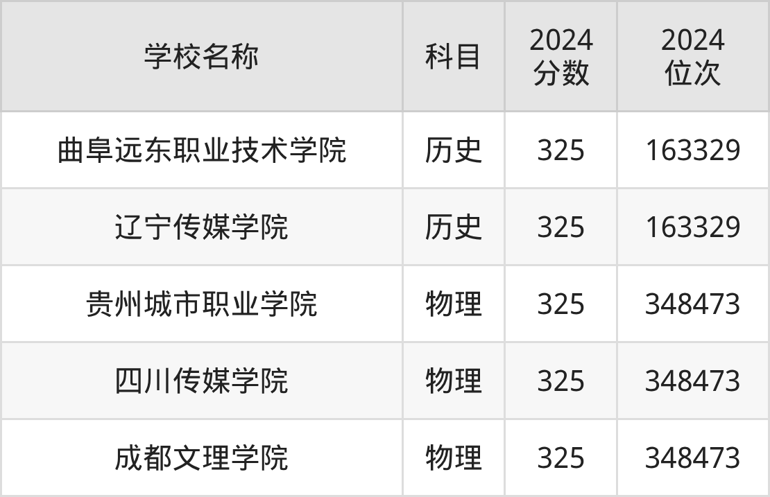 其中,物理组325分位于贵州的学校有贵州城市职业学院。历史组325分位于山东的学校有曲阜远东职业技术学院。