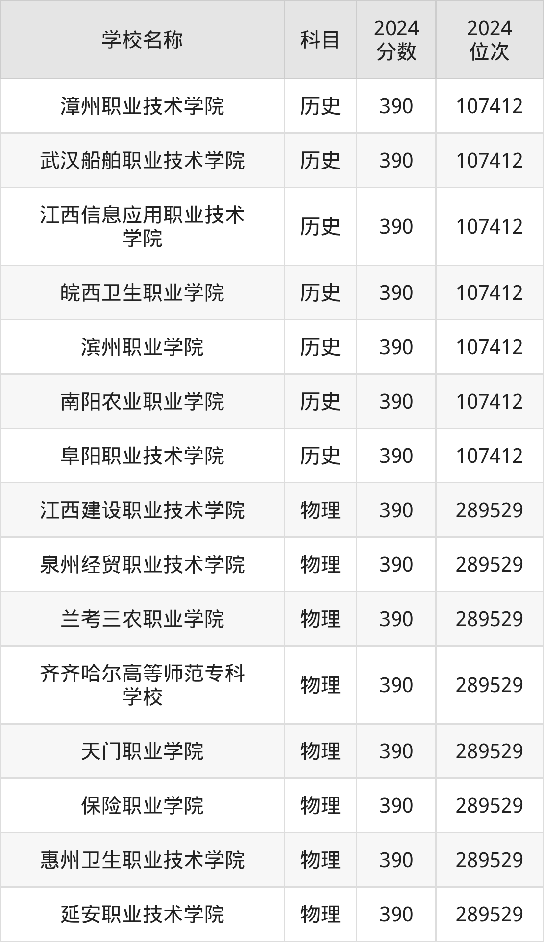 其中,物理组390分位于广东的学校有惠州卫生职业技术学院。历史组390分位于福建的学校有漳州职业技术学院。