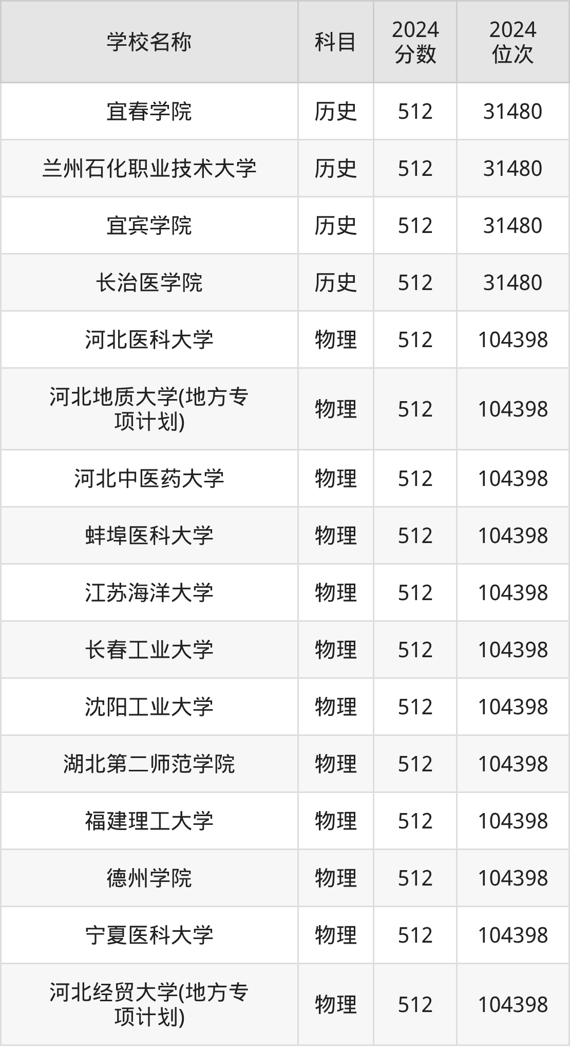 其中,物理组512分位于河北的学校有河北医科大学。历史组512分位于江西的学校有宜春学院。